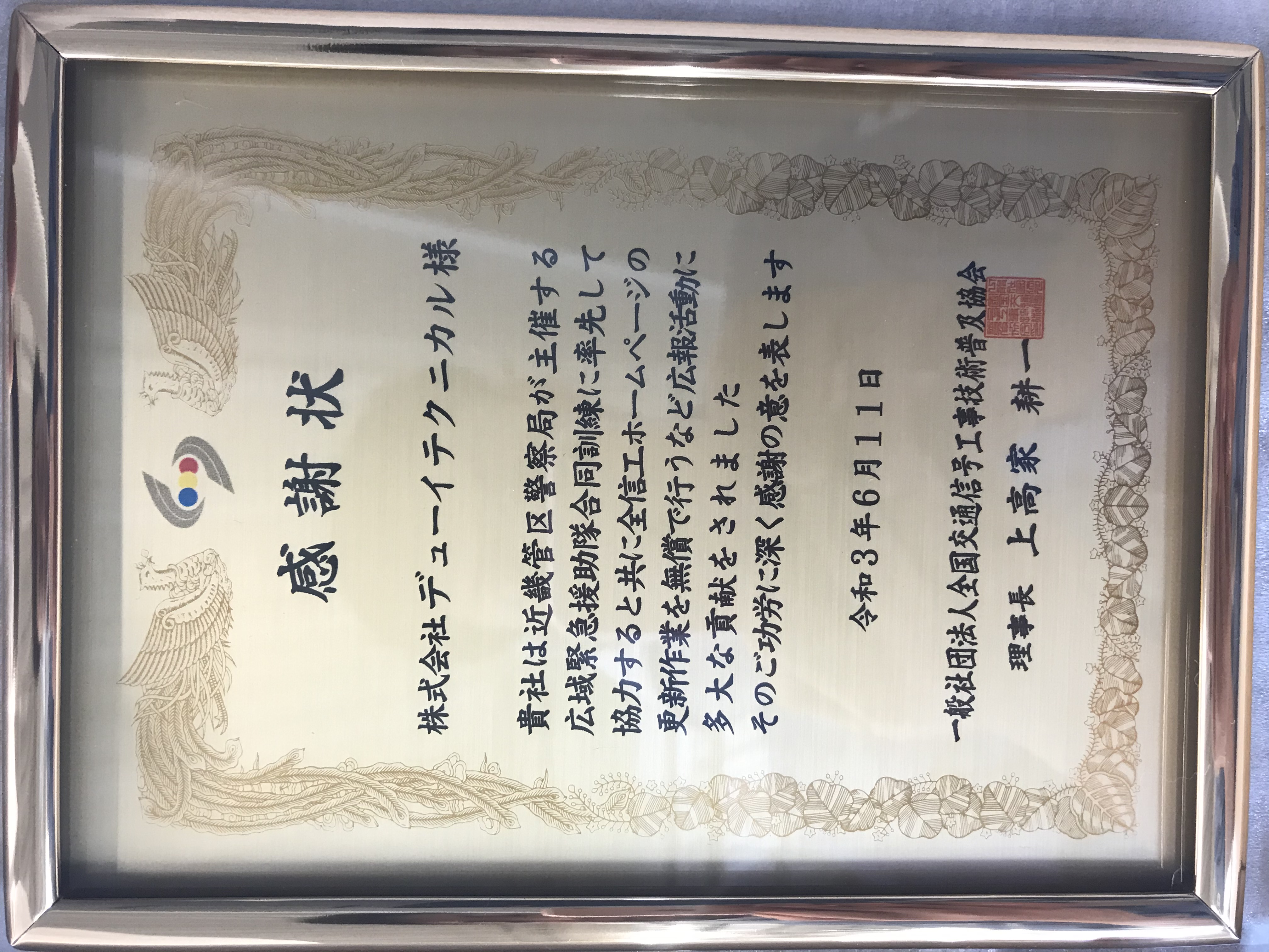 「複数年にわたり、近畿管区警察局広域緊急援助隊の合同訓練に参画し、模擬信号機の設置等の協力及び広報活動を展開するなど協会事業の発展に寄与した功績」により一般社団法人全国交通信号工事技術普及協会より感謝状を頂きました。