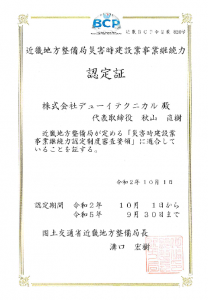 近畿地方整備局災害時建設業事業継続力(BCP)認定が更新されました。